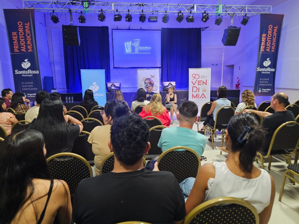 Entre los asistentes participaron comunicadores, locutores, periodistas, técnicos, docentes y una candidata a reina departamental, lo que aportó diversidad de miradas y experiencias al trabajo formativo. También estuvieron presentes autoridades locales, entre ellas Lucrecia Pereyra, directora de Cultura de Santa Rosa, acompañada por su equipo de trabajo, y Daiana Cano, coordinadora del Auditorio Municipal.